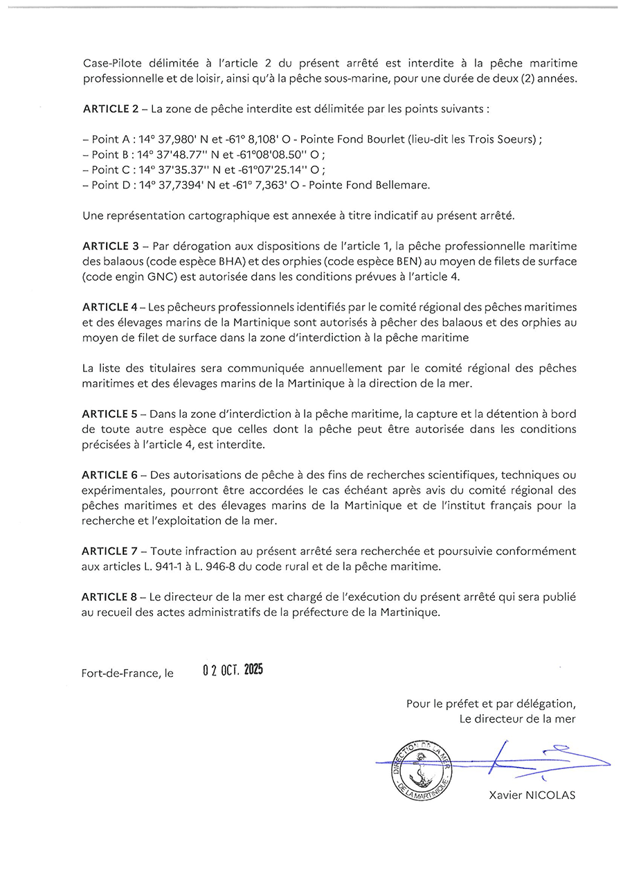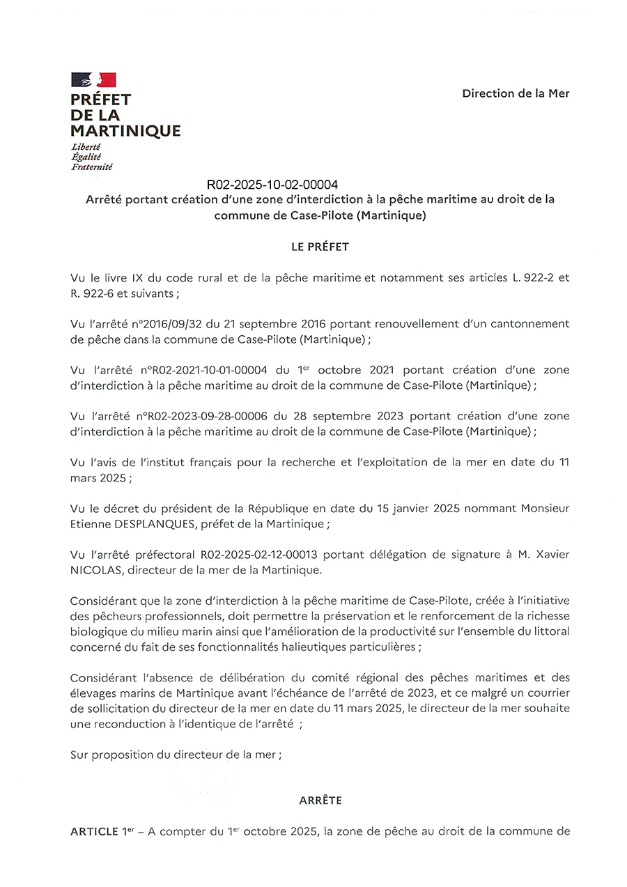 Cantonnement : Interdiction de la pêche au droit de la commune de Case-Pilote