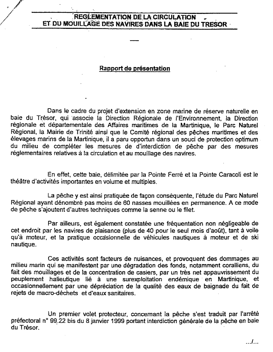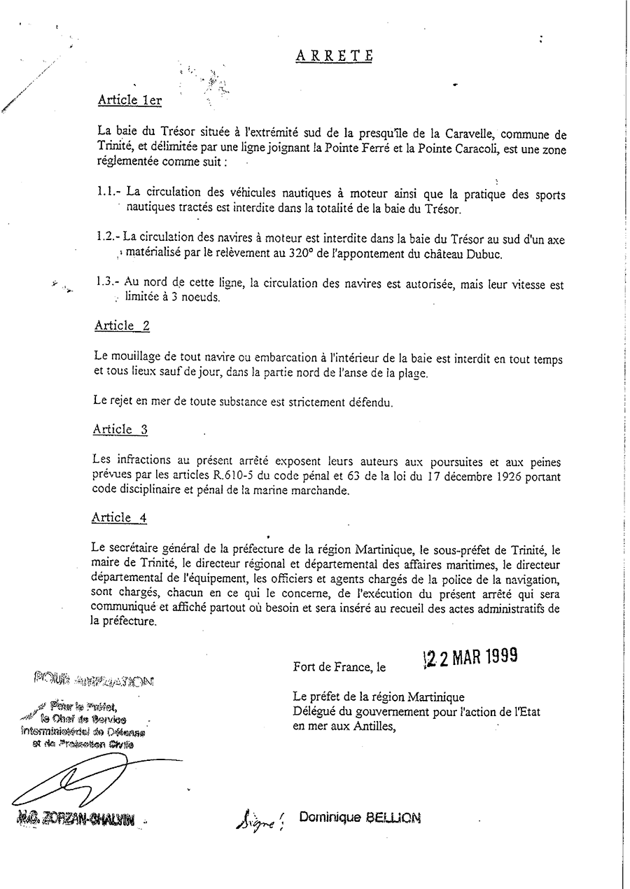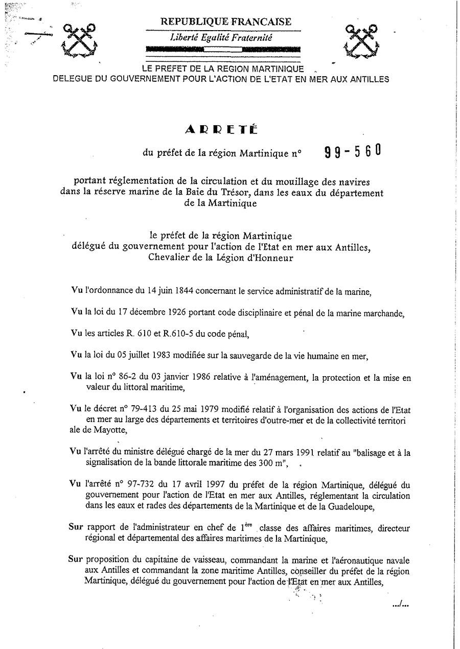 Arrêté n° 99-560 du 22 mars 1999 du Préfet de la région Martinique portant la réglementation de la circulation et du mouillage des navires dans la réserve marine de la baie du Trésor, dans les eaux du département de la Martinique.