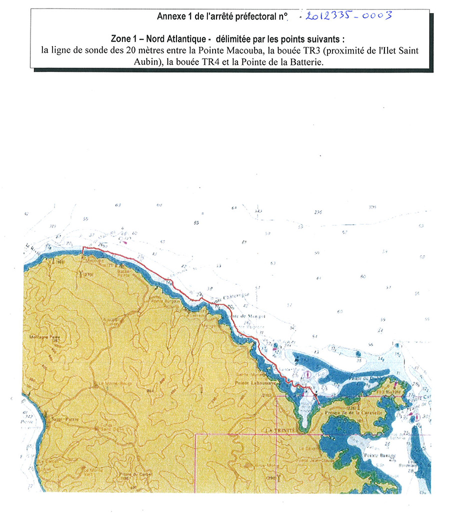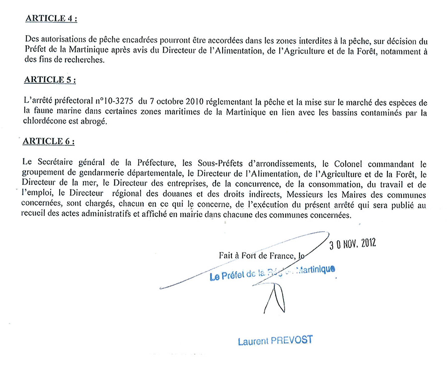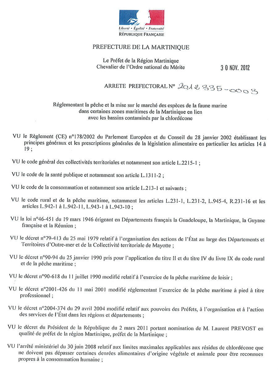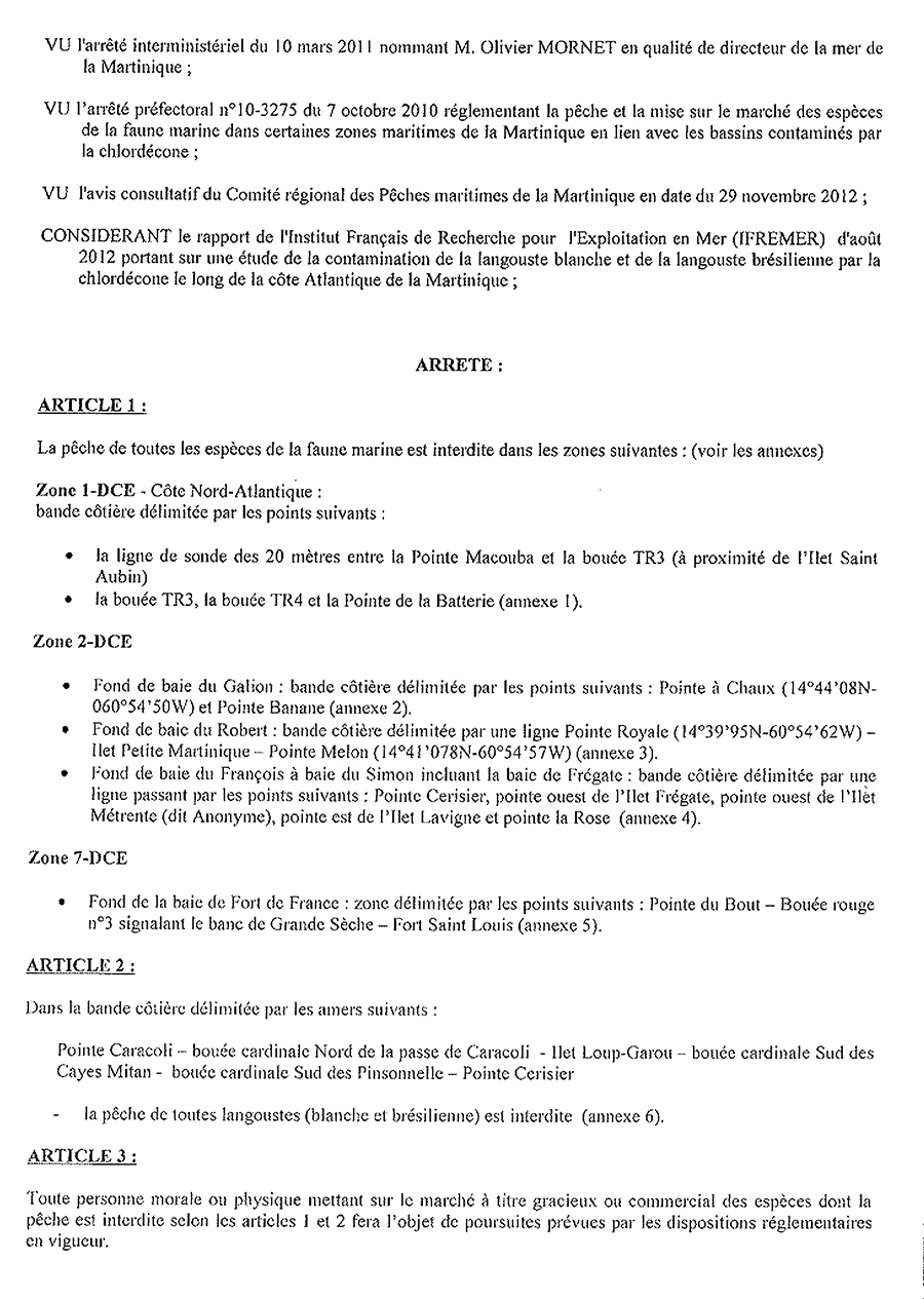 Arrêté n° 2012335-0003 du 30 novembre 2012 réglementant la pêche et la mise sur le marché des espèces de la faune marine dans certaines zones maritimes de la Martinique en lien avec les bassins contaminés par la chlordécone.