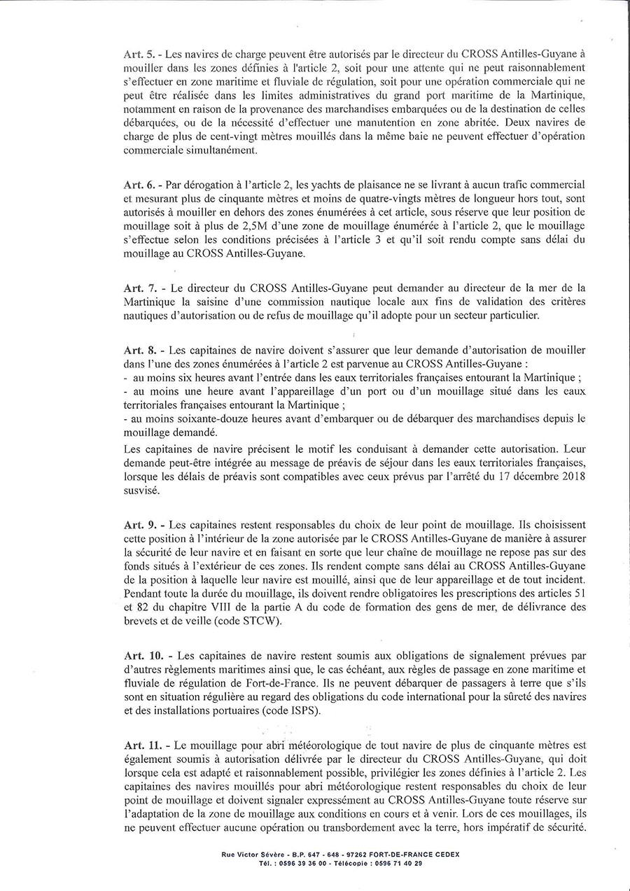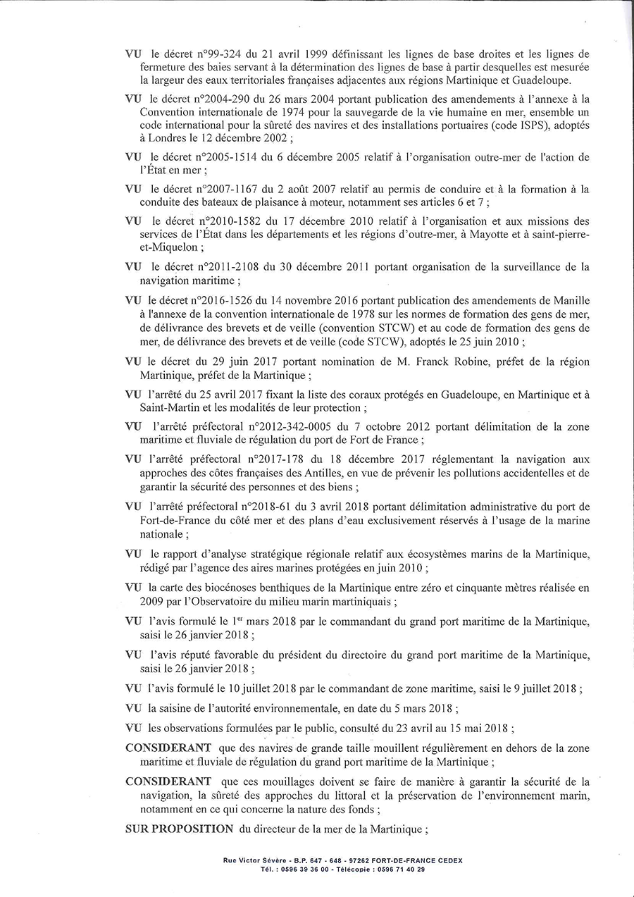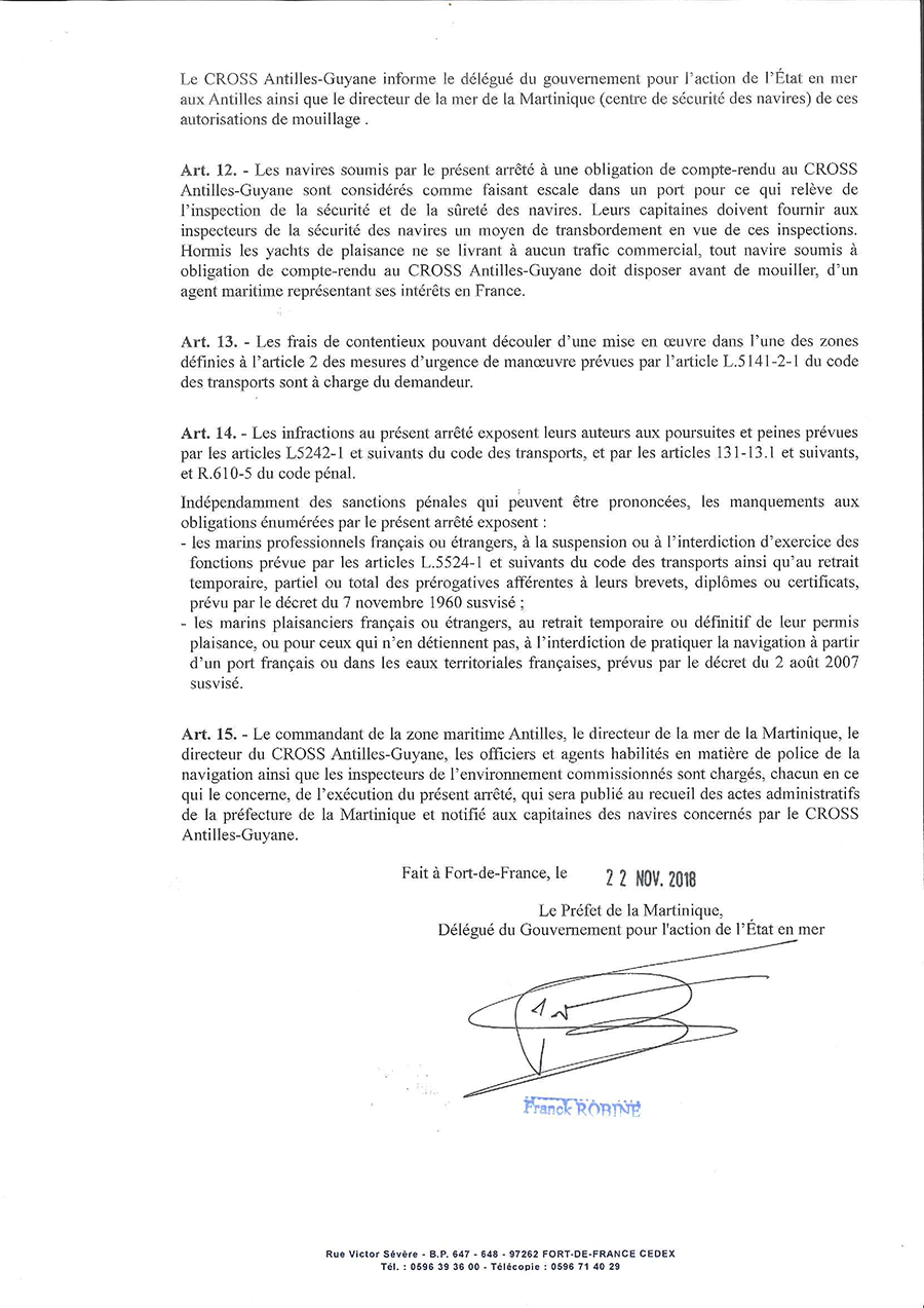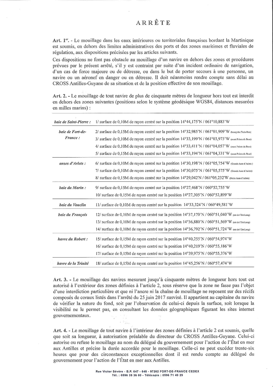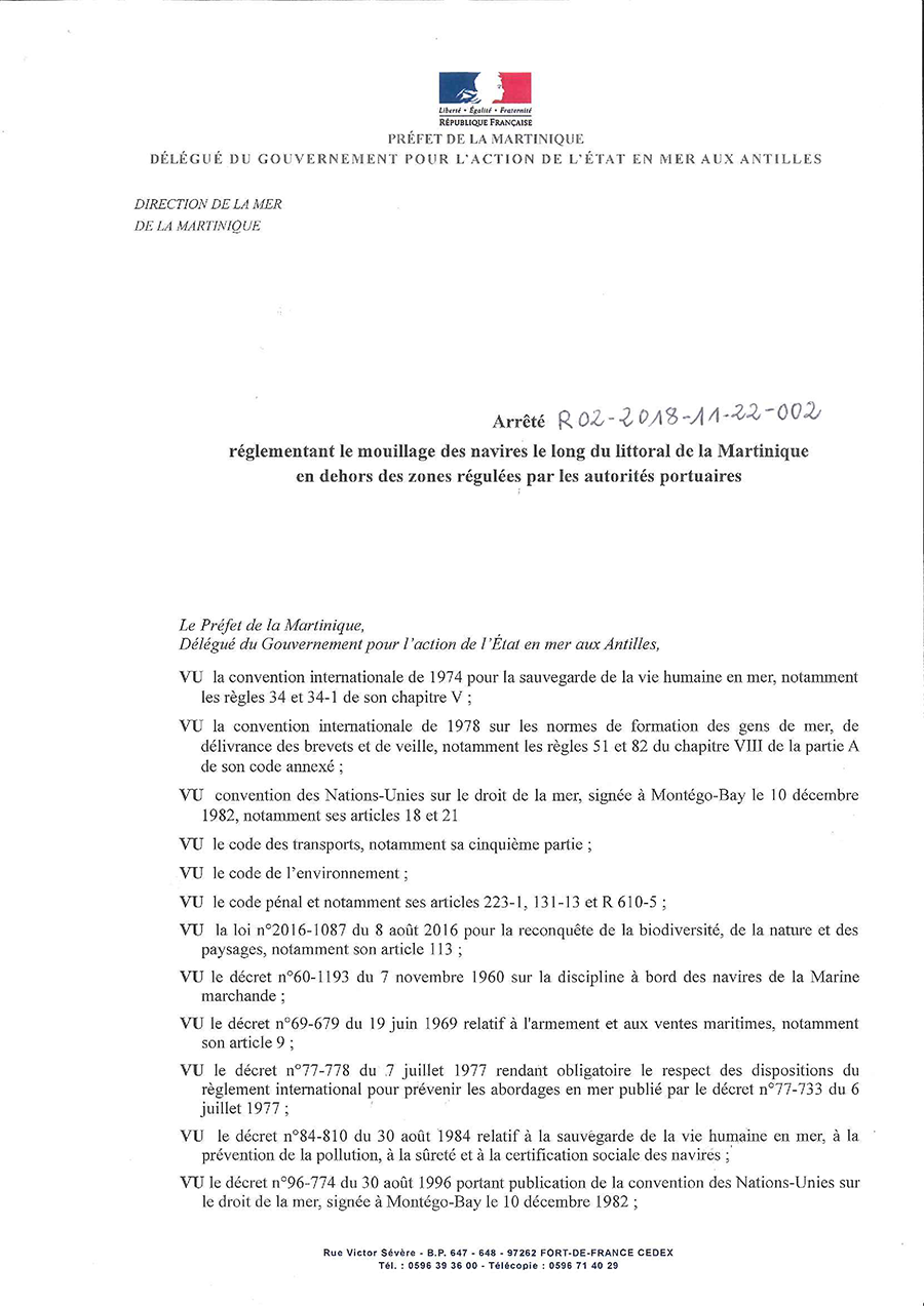 Arrêté n° R02-2018-11-22-002 du 22 novembre 2018 réglementant le mouillage des navires le long du littoral de la Martinique en dehors des zones régulées par les autorités portuaires